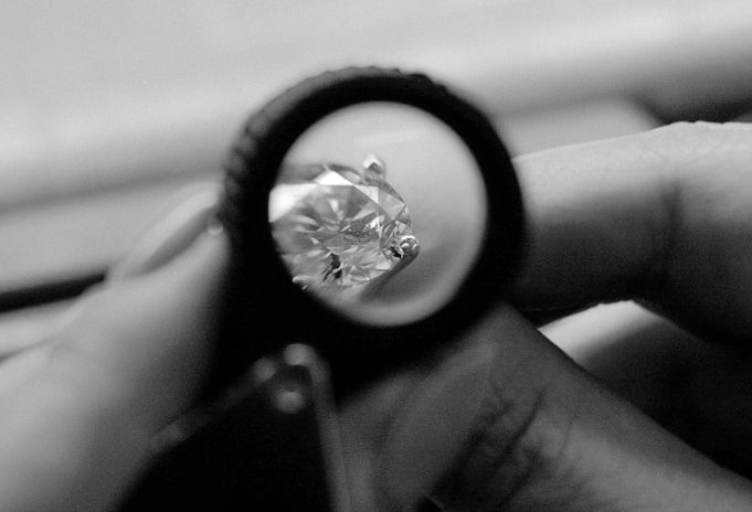 - היהלומים משובצים תחת מיקרוסקופ על ידי משבץ יהלומים מומחה.