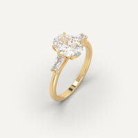 טבעת אירוסין עם יהלום מעבדה אובל 2 קראט, משובצת בזהב צהוב 14K. טבעת היהלום מגיעה בעיצוב סוליטר שלושה יהלומים קלאסי ונצחי מקולקציית טבעות האירוסין מבית המעצבת שירי אודיז ובייצור 100% כחול לבן.