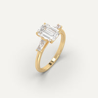טבעת אירוסין עם יהלום מעבדה אמרלד 2 קראט, משובצת בזהב צהוב 14K. טבעת היהלום מגיעה בעיצוב סוליטר שלושה יהלומים קלאסי ונצחי מקולקציית טבעות האירוסין מבית המעצבת שירי אודיז ובייצור 100% כחול לבן.