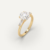 טבעת אירוסין עם יהלום מעבדה עגול 2 קראט, משובצת בזהב צהוב 14K. טבעת היהלום מגיעה בעיצוב סוליטר שלושה יהלומים קלאסי ונצחי מקולקציית טבעות האירוסין מבית המעצבת שירי אודיז ובייצור 100% כחול לבן.