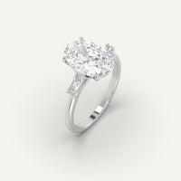 טבעת אירוסין עם יהלום מעבדה אובל 4 קראט, משובצת בזהב לבן 14K. טבעת היהלום מגיעה בעיצוב סוליטר שלושה יהלומים קלאסי ונצחי מקולקציית טבעות האירוסין מבית המעצבת שירי אודיז ובייצור 100% כחול לבן.
