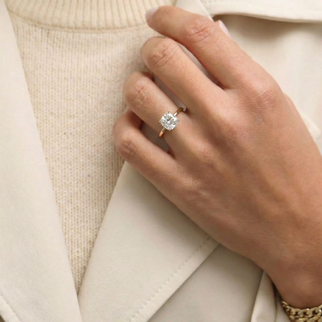 טבעת אירוסין עם יהלום מעבדה קושן 2 קראט, משובצת בזהב צהוב 14K. טבעת היהלום מגיעה בעיצוב סוליטר קלאסי ונצחי מקולקציית טבעות האירוסין מבית המעצבת שירי אודיז ובייצור 100% כחול לבן.