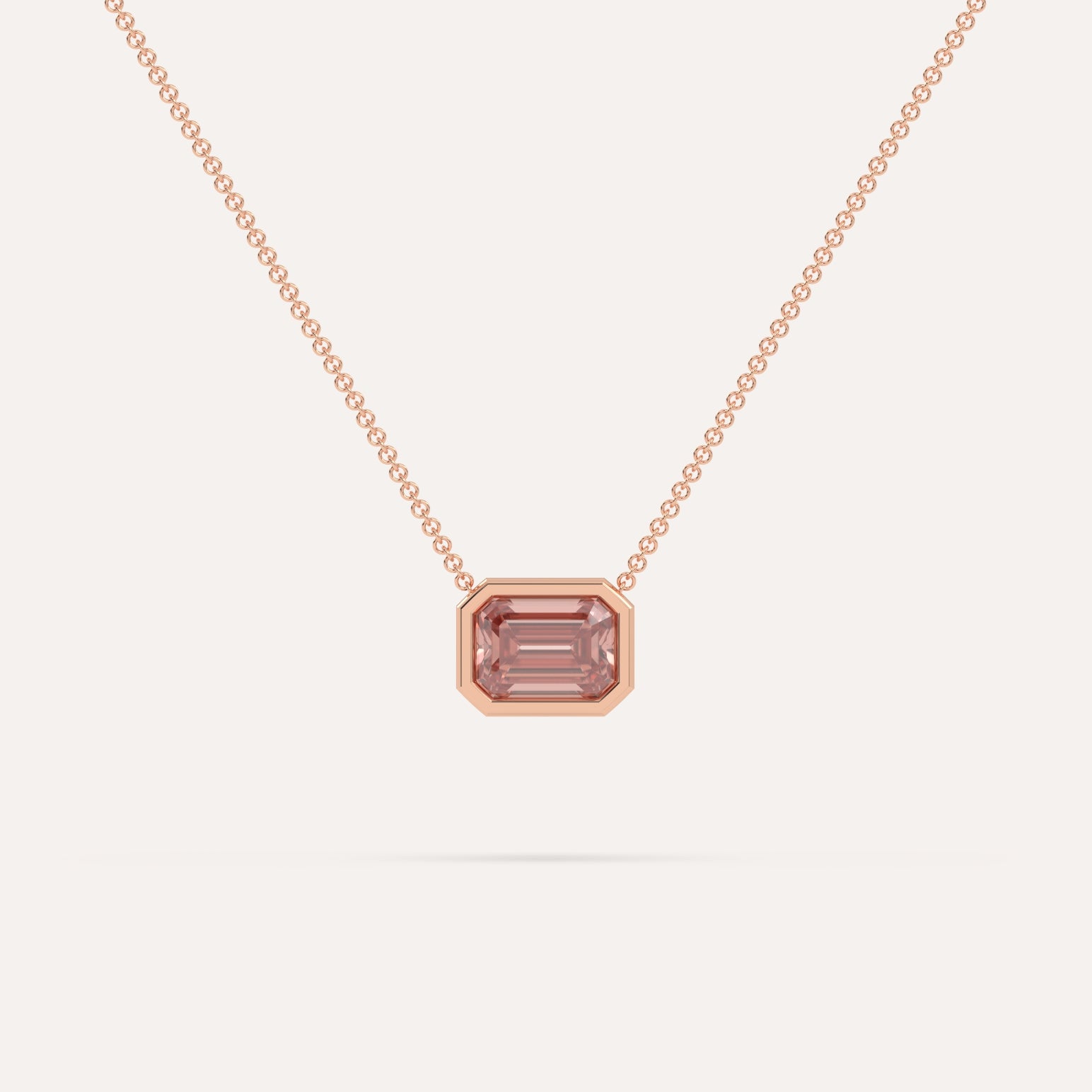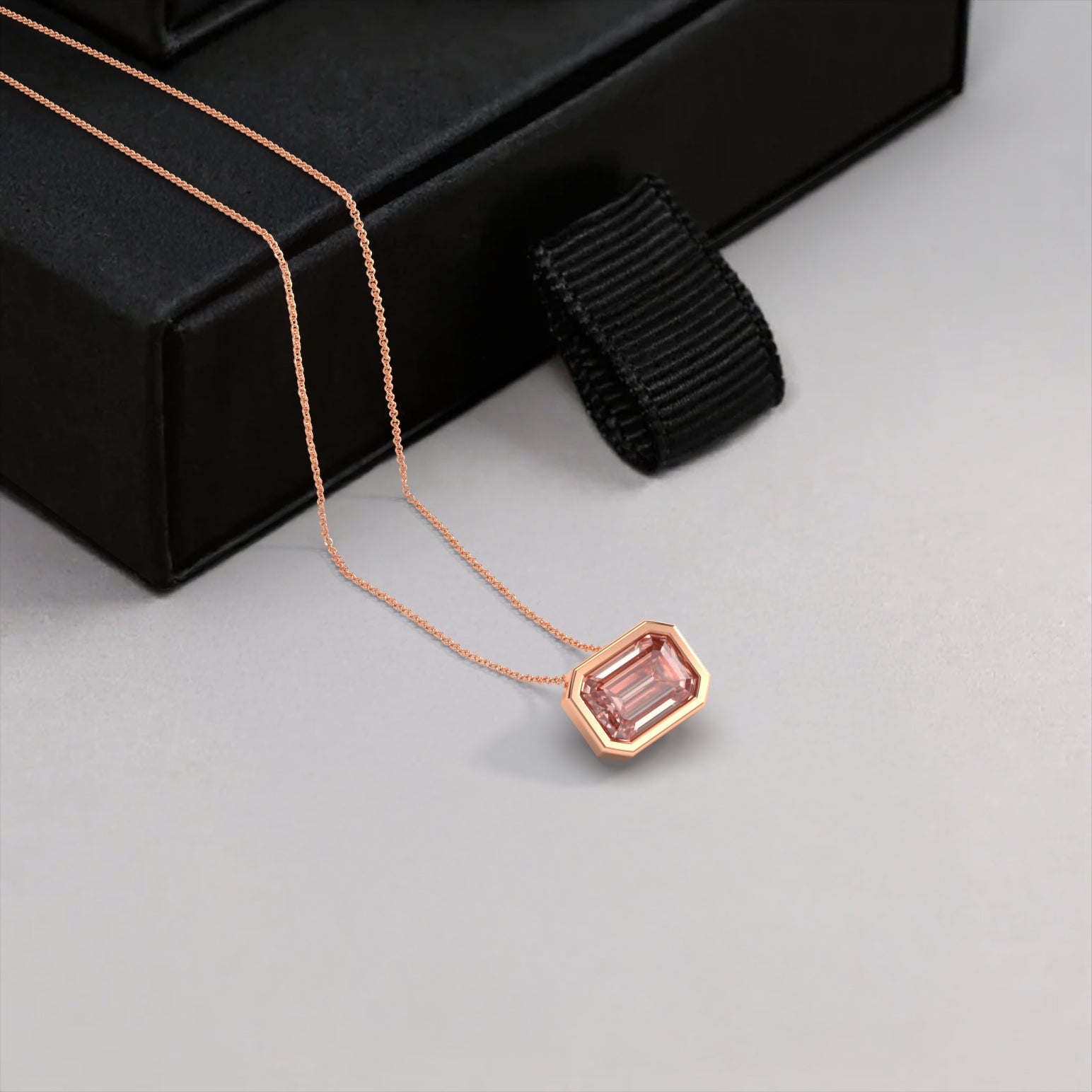 שרשרת יהלום מרחף המשובצת יהלום ורוד 1.00 קראט אמרלד בזהב אדום 14K. יהלומים ורודים הם הנדירים והנחשקים ביותר בעולם, והיום ברי השגה כיהלומי מעבדה 100% אמיתיים וזהים ליהלום ורוד השווה מיליוני דולרים. השרשרת מגיעה בעיצוב קלאסי, מיוצרת בעבודת יד כחול לבן.