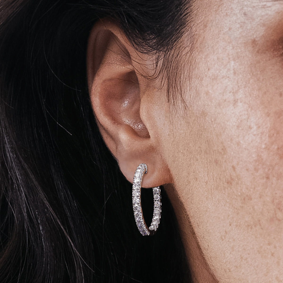 עגילי חישוק יהלומים, משובצים 2 קראט יהלומים סה״כ (1 קראט כל עגיל) בזהב לבן 14K העגילים מגיעים בקוטר 24מ״מ בעיצוב קלאסי ונצחי המתאים לענידה יומיומית.