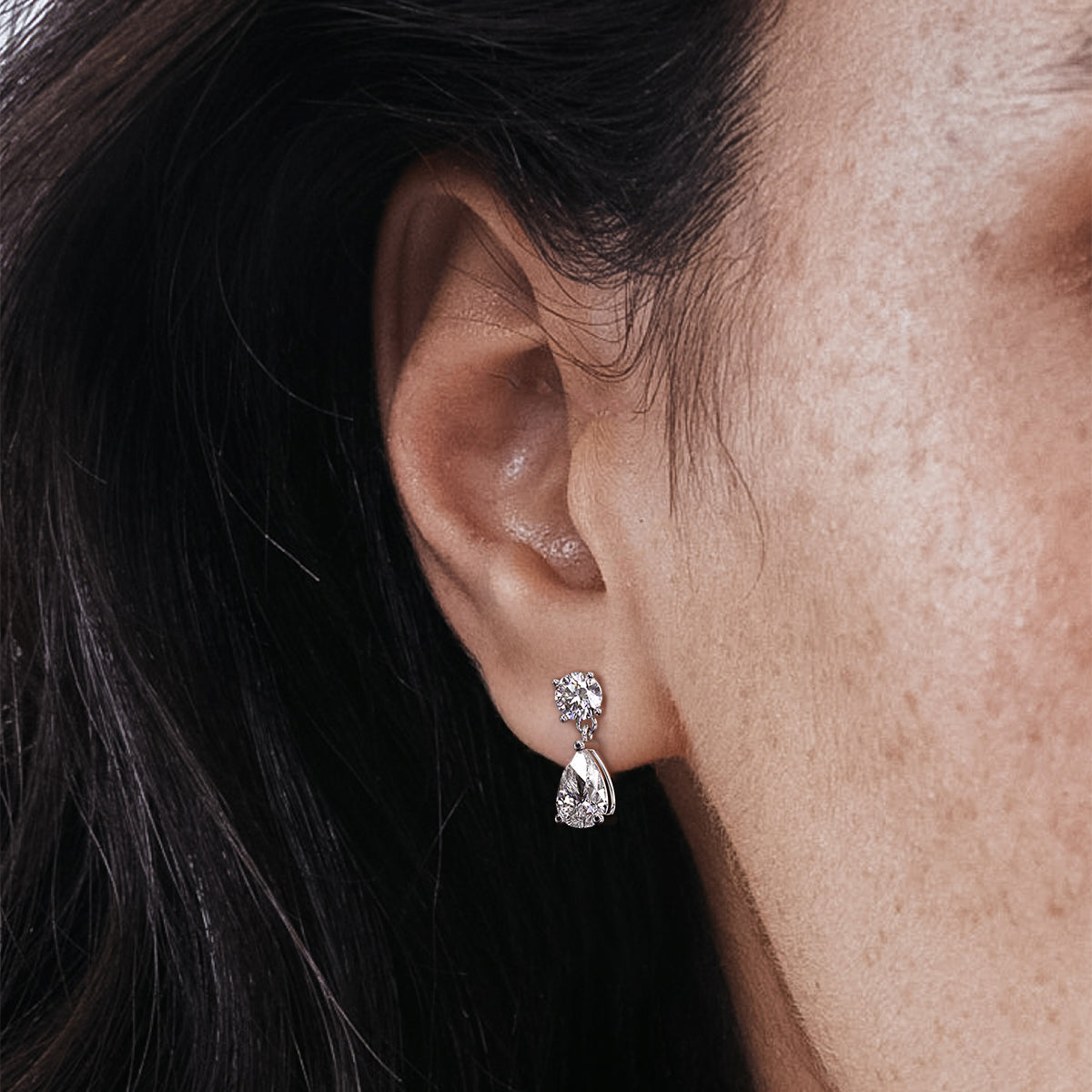 עגילי יהלום טיפה תלויים, משובצים 2 קראט יהלומים סה״כ (1 קראט כל עגיל) בזהב לבן 14K. בעיצוב קלאסי ונצחי המתאים לענידה יומיומית.