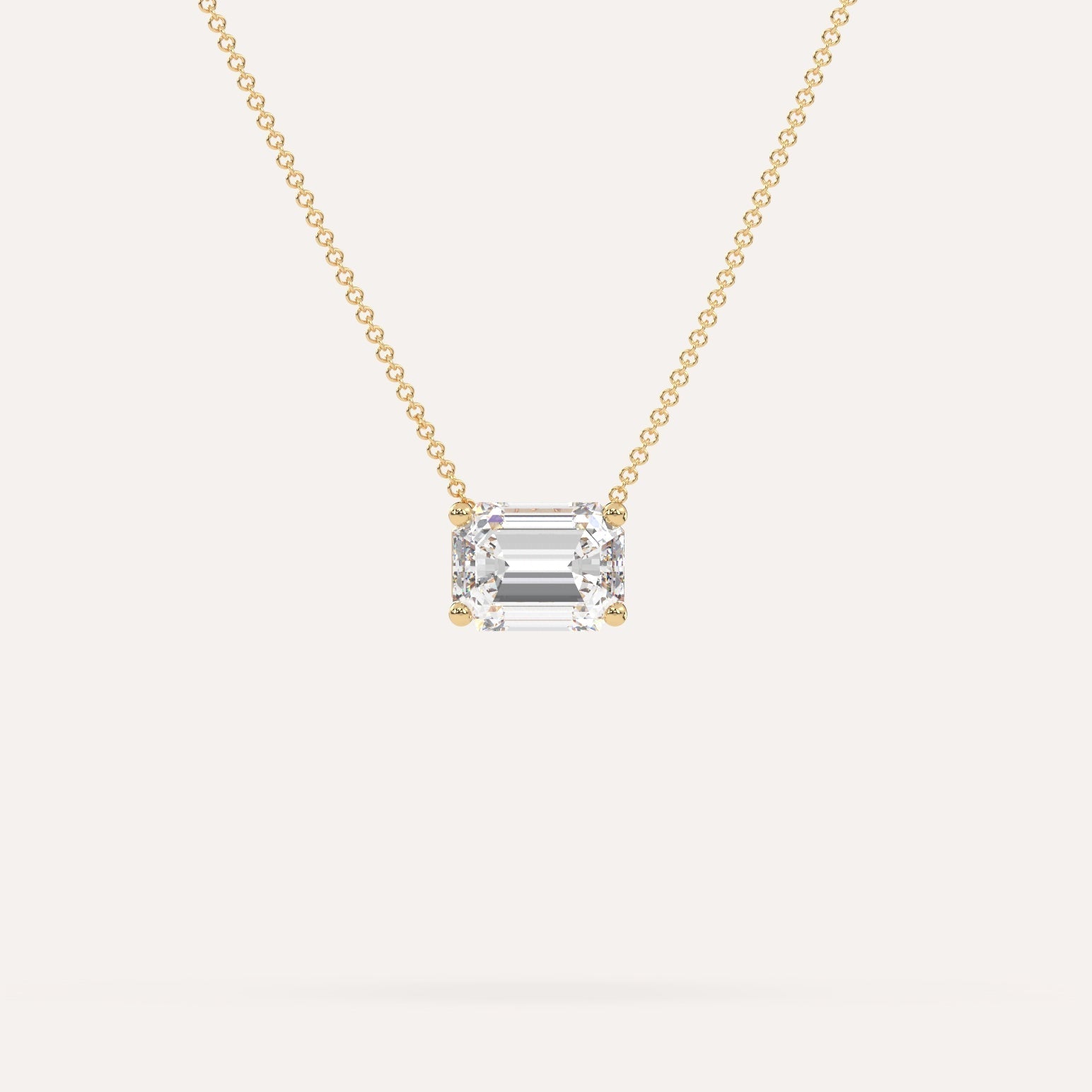 שרשרת יהלום מרחף המשובצת יהלום מעבדה 3 קראט אמרלד בזהב צהוב 14K. השרשרת מגיעה בעיצוב קלאסי, מיוצרת בעבודת יד כחול לבן.