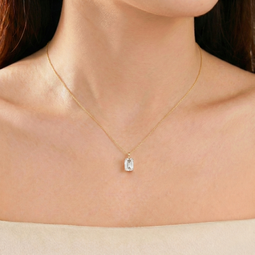 שרשרת יהלום קלאסית המשובצת יהלום טבעי 2 קראט אמרלד בזהב צהוב 14K. השרשרת מגיעה בעיצוב נקי, מיוצרת בעבודת יד כחול לבן.