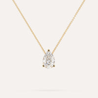 שרשרת יהלום מרחף המשובצת יהלום מעבדה 2 קראט טיפה בזהב צהוב 14K. השרשרת מגיעה בעיצוב קלאסי, מיוצרת בעבודת יד כחול לבן.