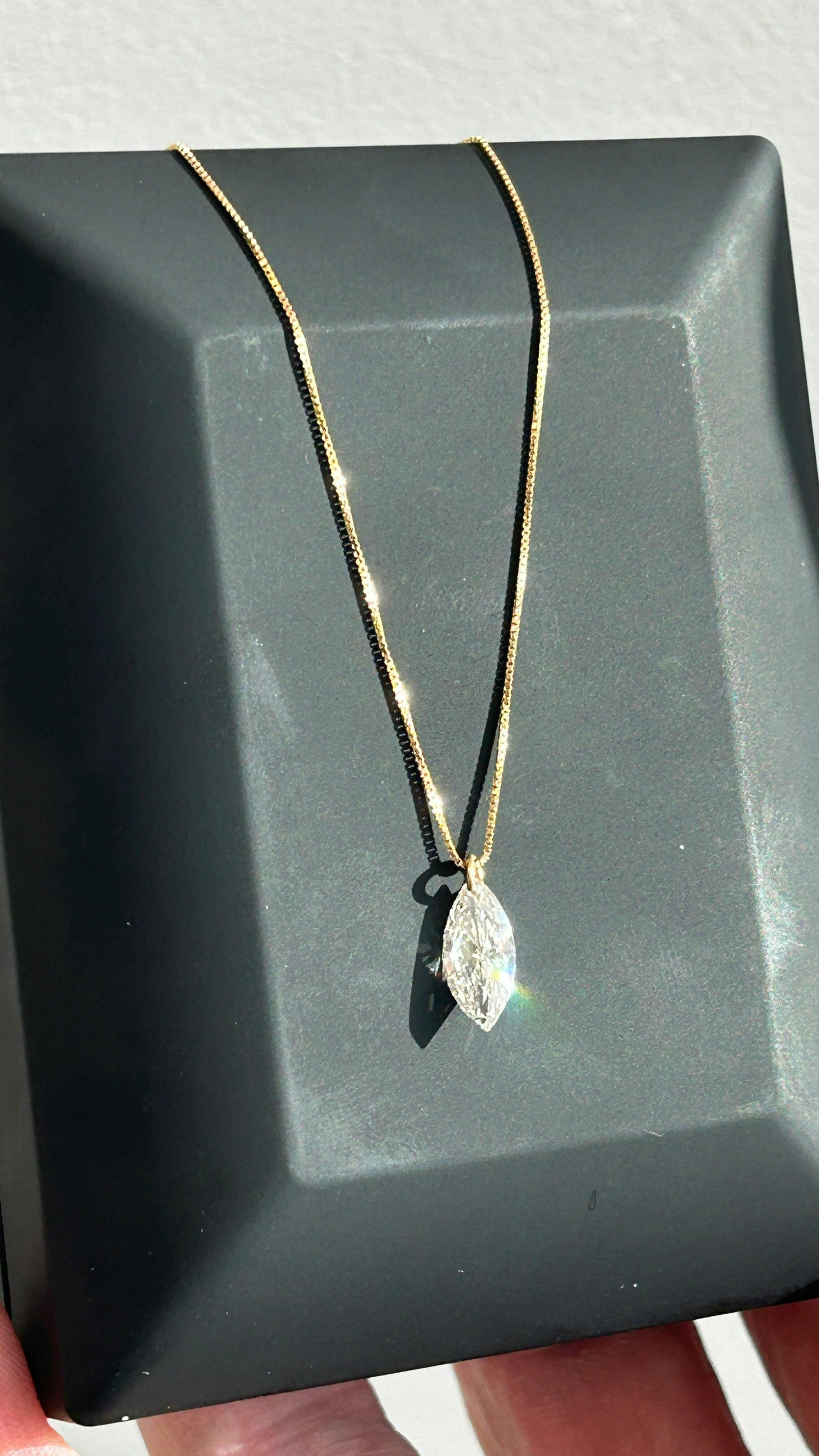 שרשרת יהלום מעבדה מרחף 1 קראט מרקיזה בזהב לבן 14K. השרשרת בסגנון ונציה באורך 42 ס״מ ומגיעה בעיצוב ייחודי ללא בית זהב אלא השחלה דרך היהלום למראה מינימליסטי ונקי - יהלום מרחף אמיתי!