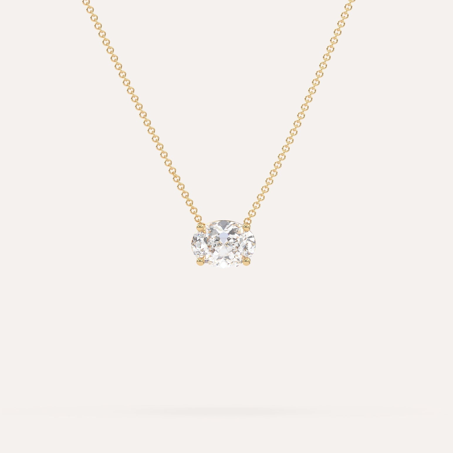 שרשרת יהלום מרחף המשובצת יהלום מעבדה 1 קראט אובל בזהב צהוב 14K. השרשרת מגיעה בעיצוב קלאסי, מיוצרת בעבודת יד כחול לבן.