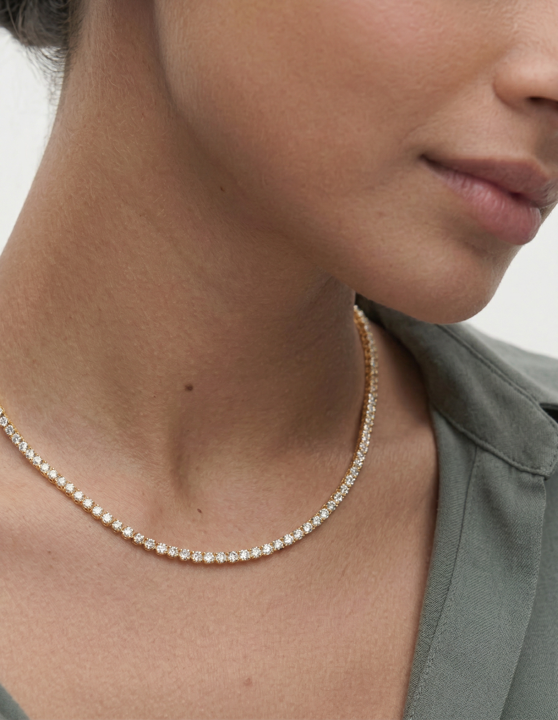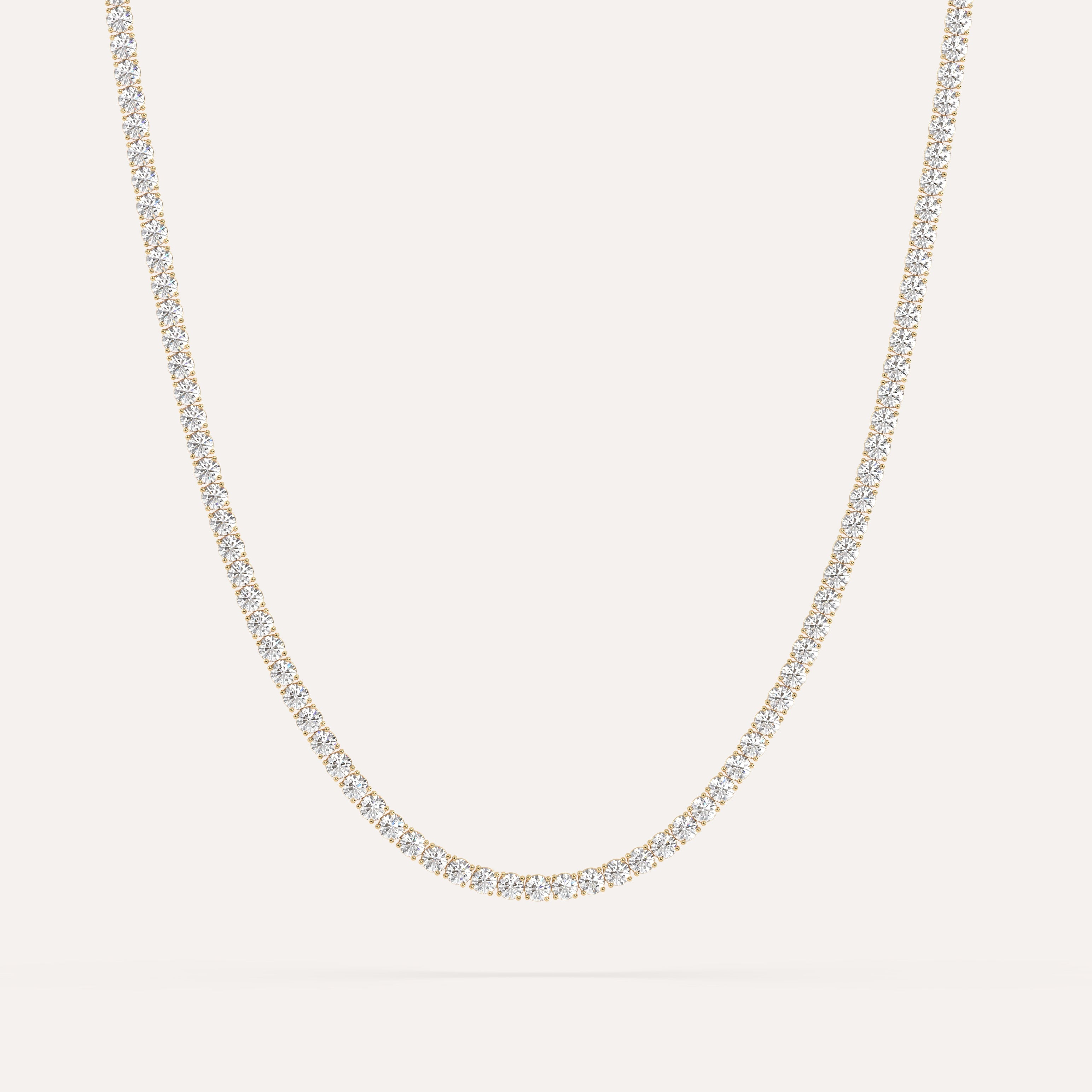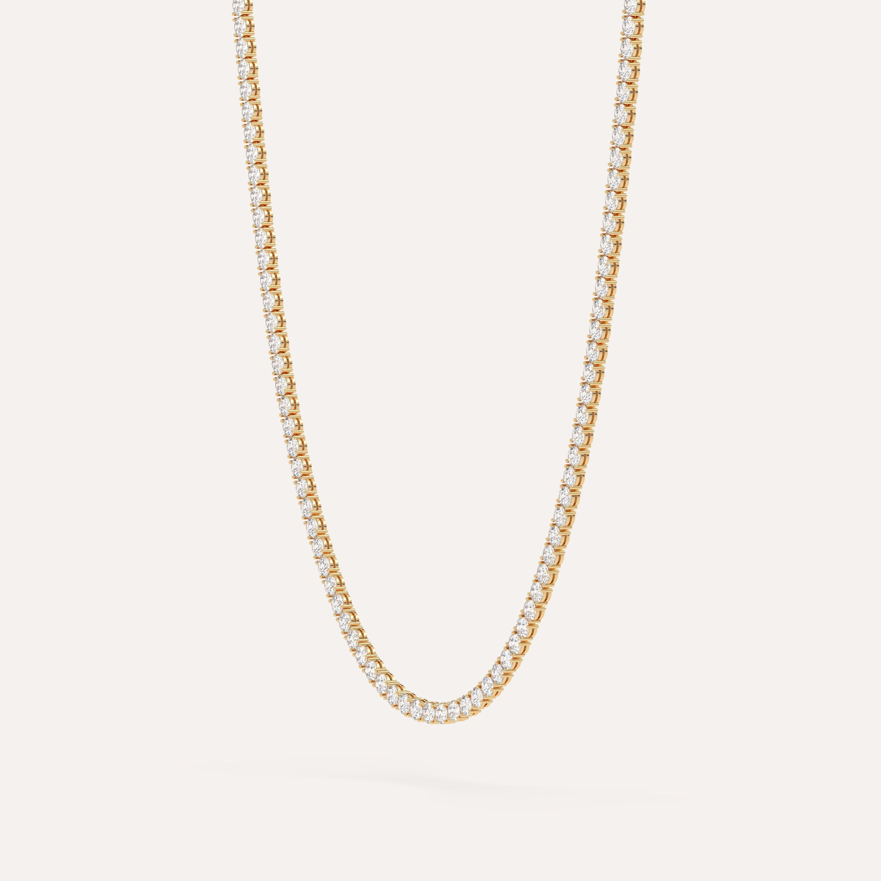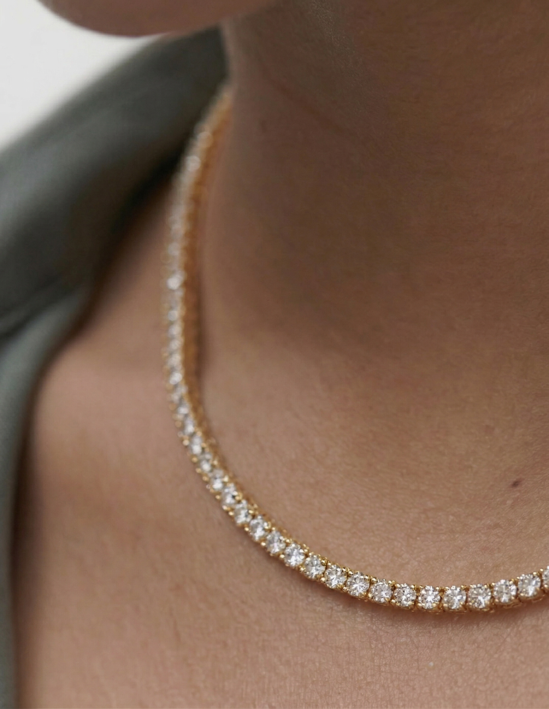 שרשרת טניס יהלומים עם יהלומים טבעיים באיכות G/SI1 במשקל 10 קראט. השרשרת מגיעה בקוספא מהודרת בזהב צהוב 14K, בעיצוב מרהיב ונוצץ.