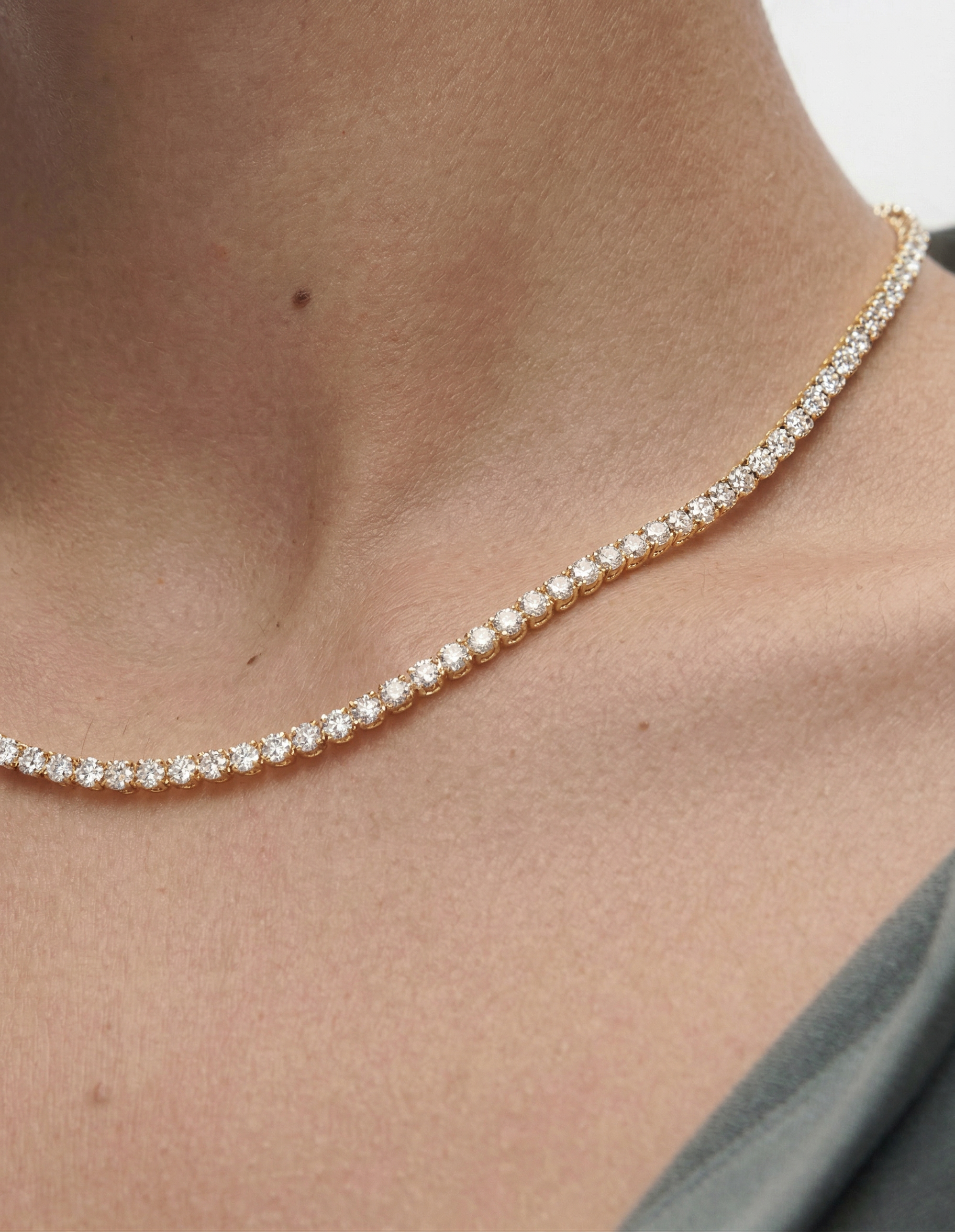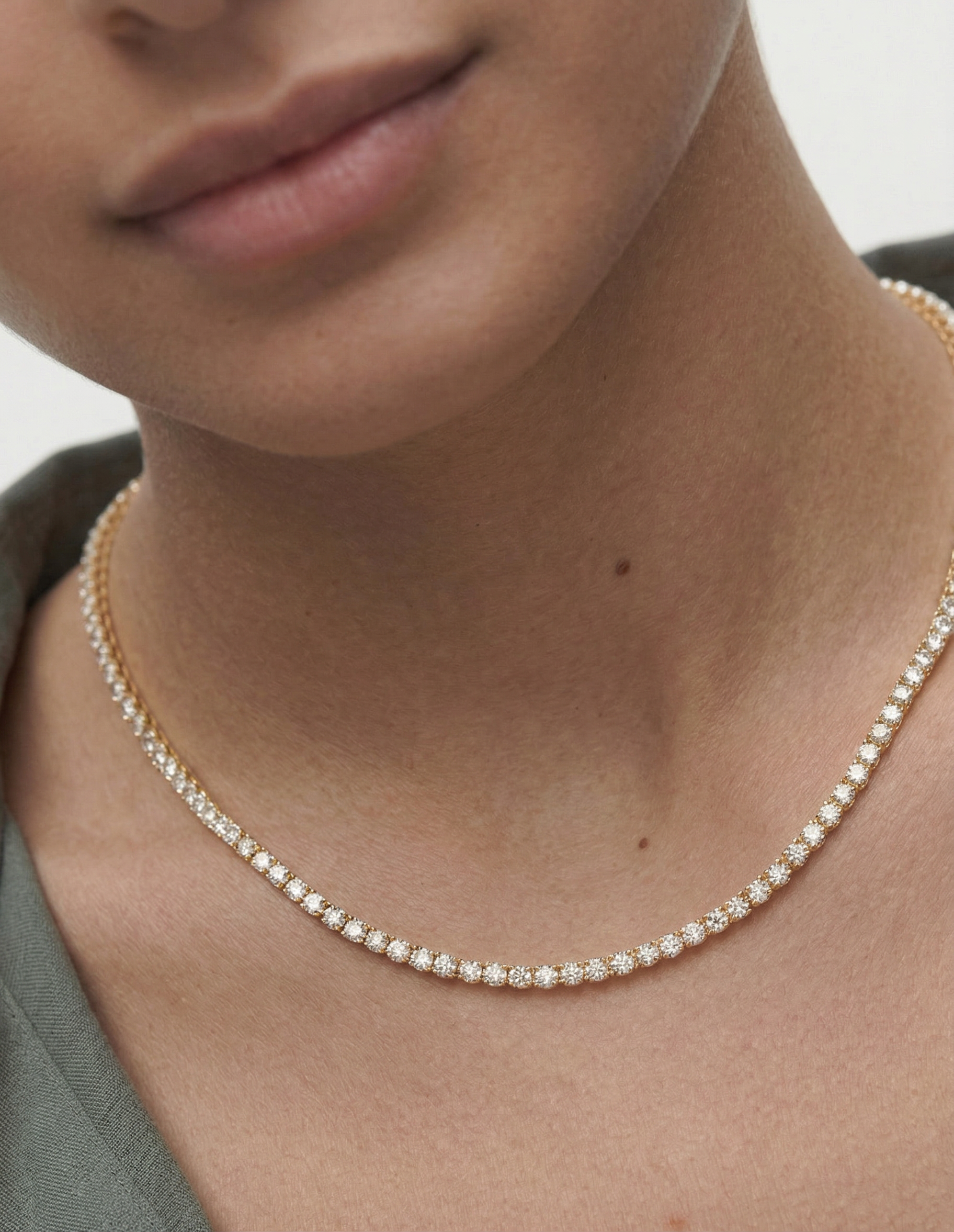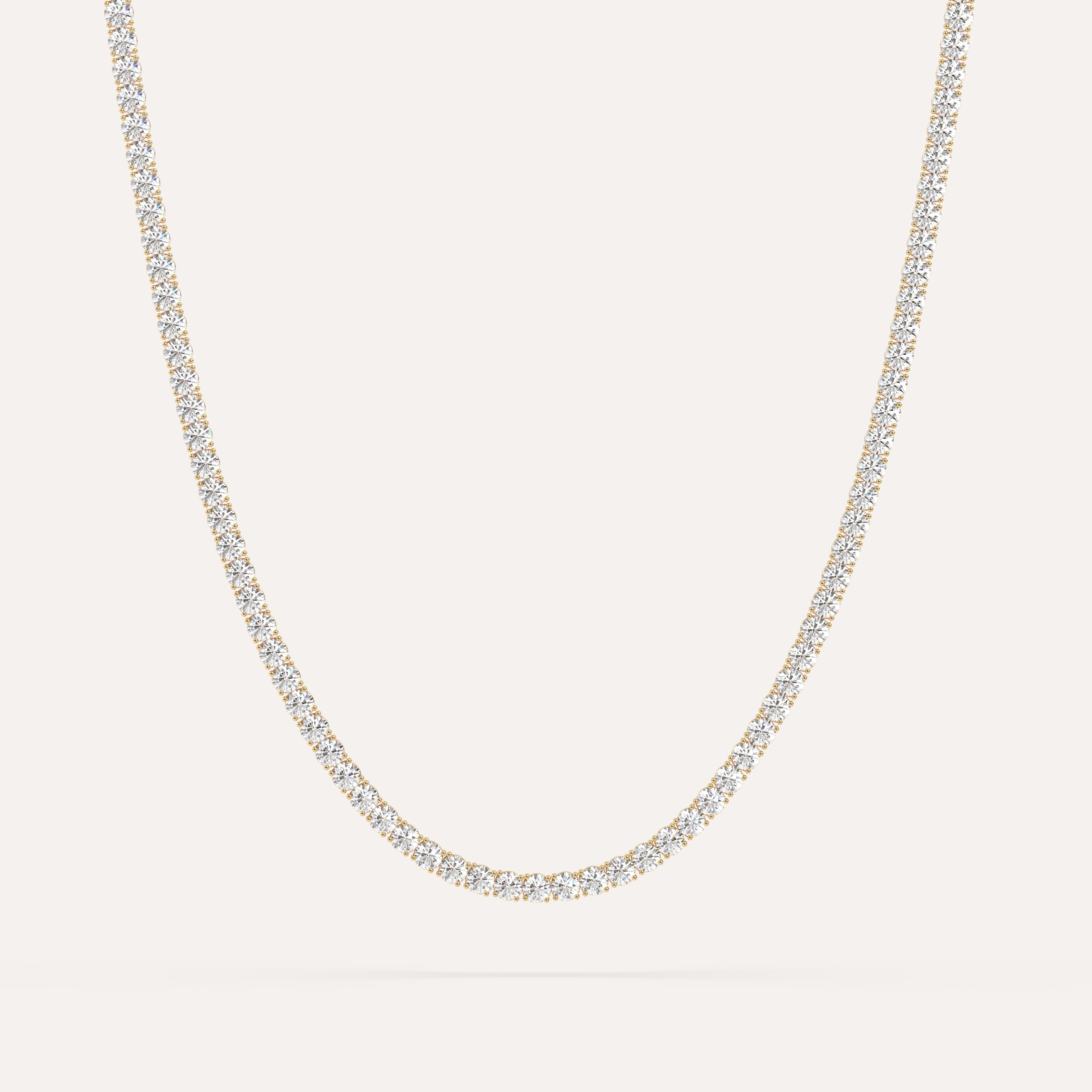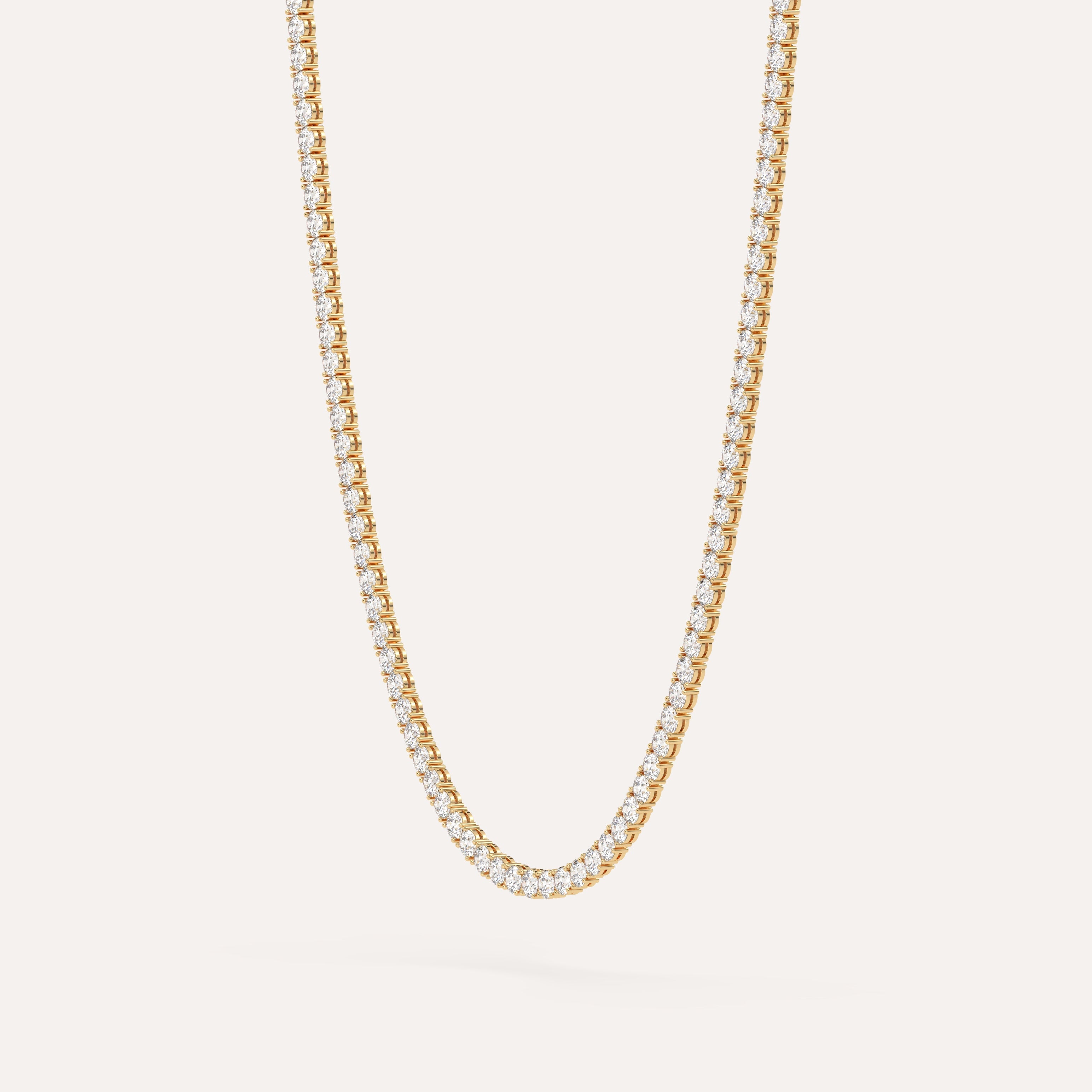 שרשרת טניס יהלומים עם יהלומי מעבדה באיכות F/VS1 במשקל 13 קראט. השרשרת מגיעה בקוספא מהודרת בזהב צהוב 14K, בעיצוב מרהיב ונוצץ.