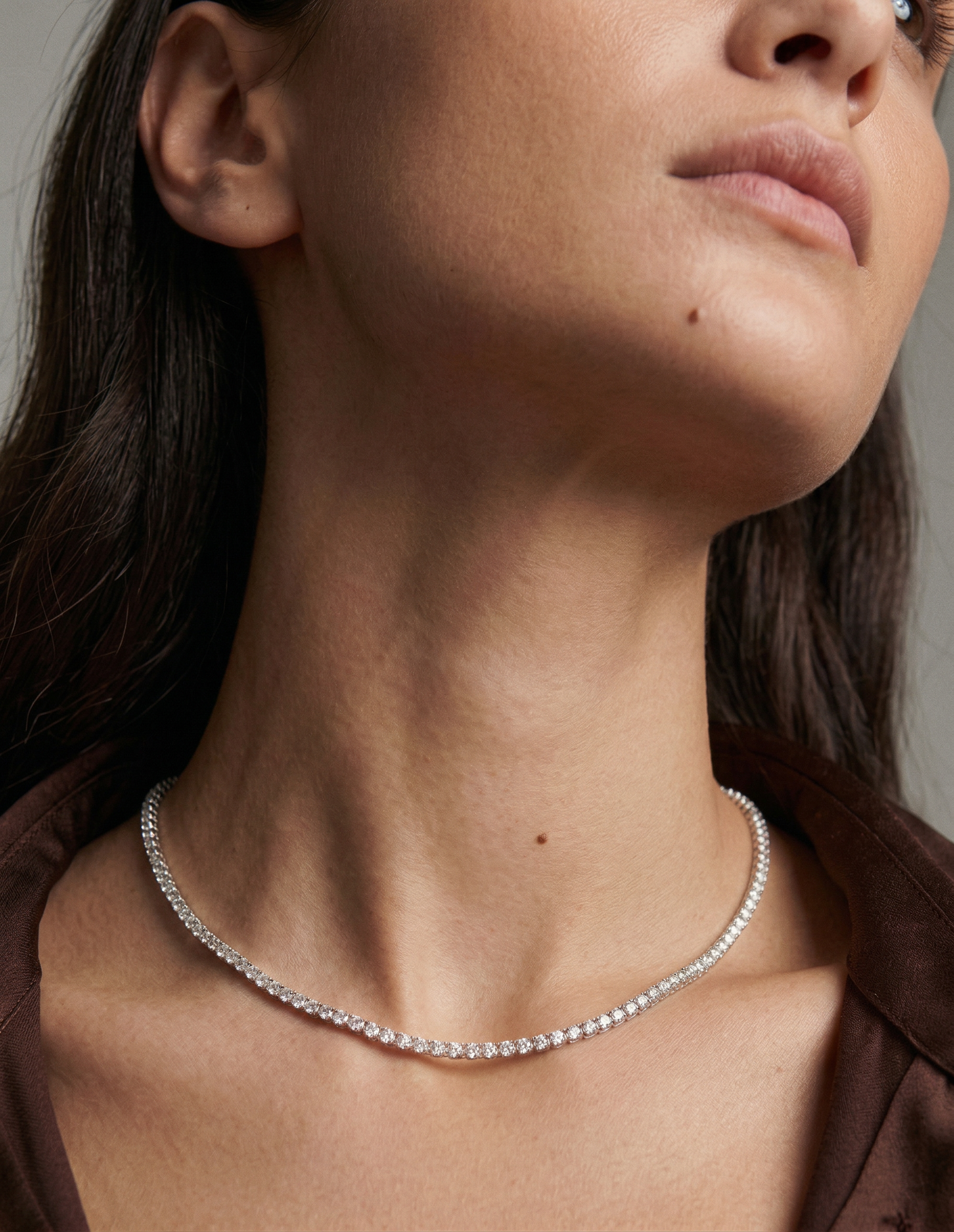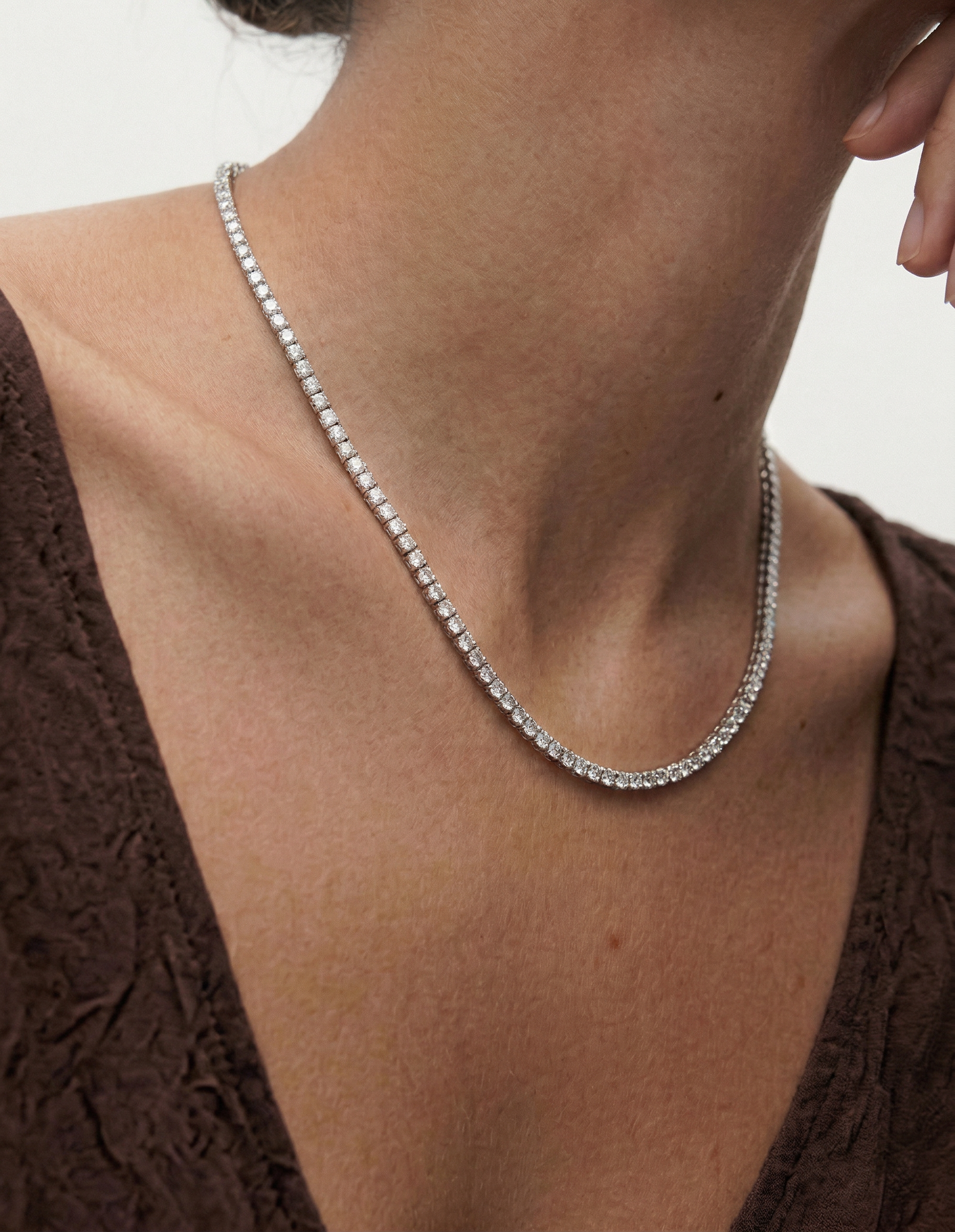 שרשרת טניס יהלומים עם יהלומים טבעיים באיכות G/SI1 במשקל 16 קראט. השרשרת מגיעה בקוספא מהודרת בזהב לבן 14K, בעיצוב מרהיב ונוצץ.
